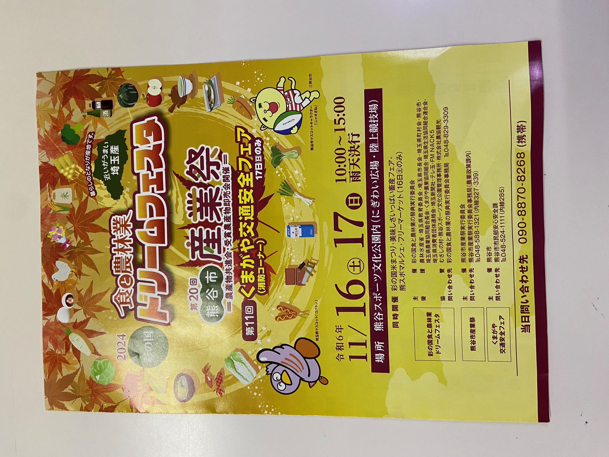 2024/11/15 11月16日(土)・17日(日)熊谷市産業祭に出店します!! 開催日:11月16日(土)・17日(日) 午前10時~午後3時 雨天決行場所:熊谷スポーツ文化公園 にぎわい広場及び陸上競技場ブースNO.70 でお待ちしております。当日は食と農林業ドリームフェスタ、くまがや交通安全フェアも同時開催致します。周辺道路も大変混雑しますので時間に余裕をもって会場にお越しください。